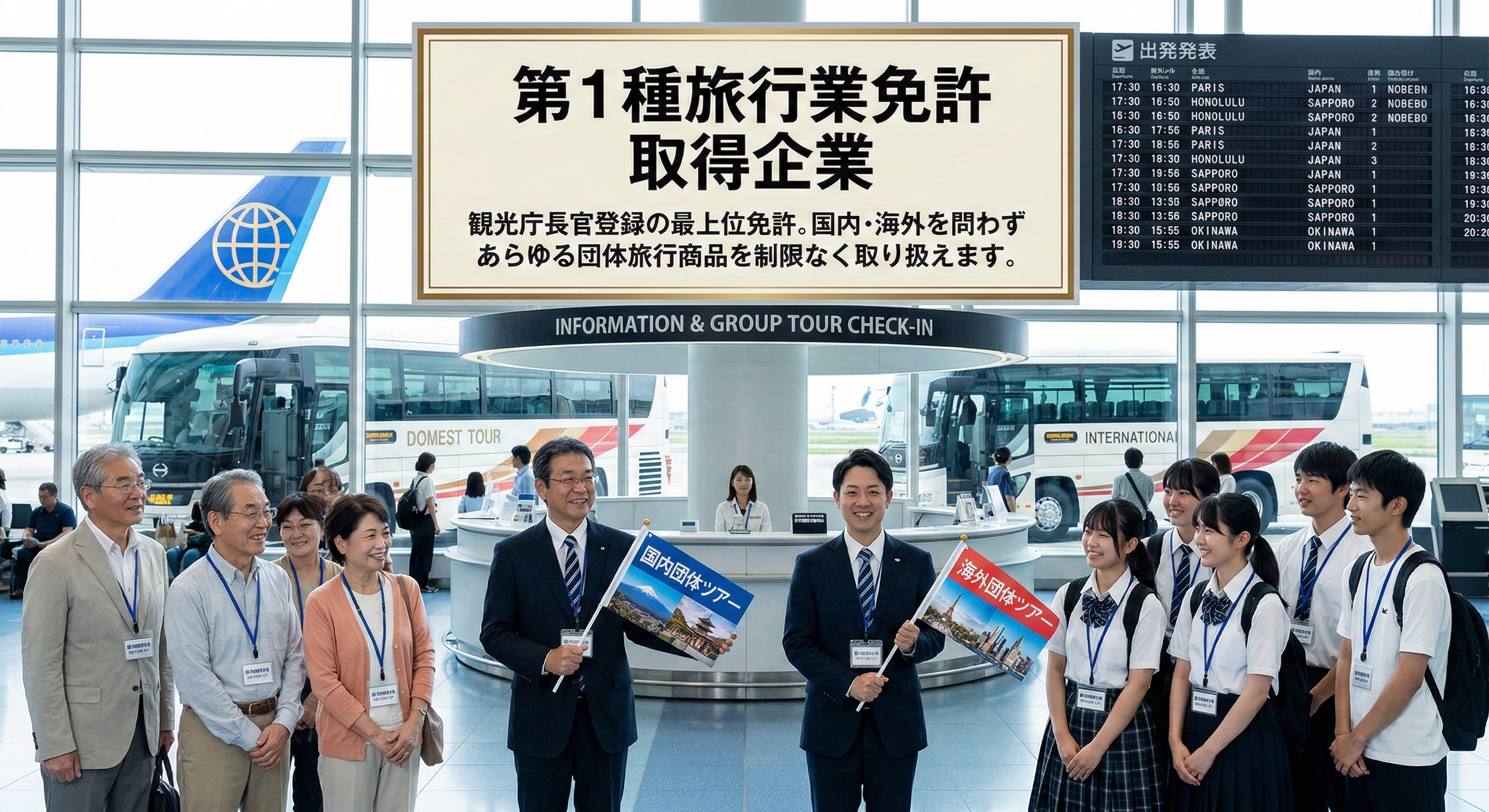 観光庁長官登録の最上位免許。国内・海外を問わずあらゆる団体旅行商品を制限なく取り扱えます。
